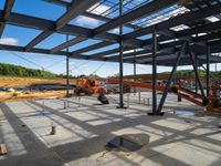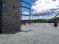 A view of a construction site in an open space with a cloudy sky and concrete surfaces during the day. The photo captures one quarter of the construction site from a profile perspective.