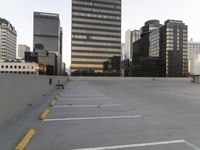 A view of a metropolitan area in the early morning, with a sky filled with skyscrapers, high-rise buildings, and a parking deck in the foreground. The city is alive, with its concrete and asphalt roads, public spaces, and infrastructure all clearly visible in the skyline.