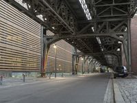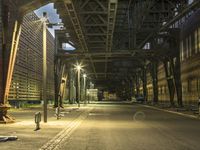 A view of a bridge and office building at midnight in Berlin, Germany. The symmetrical urban design is illuminated by artificial light, including street lights and the beams of headlights from automobiles, creating light streaks and tints and shades. The bridge is set against a backdrop of a factory, vegetation, and a trunk of a tree, all of which is part of the infrastructure of the metropolitan area.