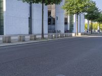 The modern architecture of a business district in Berlin, Germany, is illuminated by the warm sunlight of a summer day. The asphalt roads, public benches, and outdoor furniture of the neighborhood are highlighted against a backdrop of high-rise condominiums, office buildings, and trees. The urban design showcases a variety of materials, including grey composite, wood, and tar, and creates a unique atmosphere for the city.