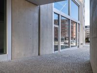 A profile of a modern architecture office building in a residential business district of Berlin, Germany. A clear sky day with a snow-covered cobble stone surface and concrete curb provide a contrast of urban design elements.