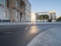 A modern high-rise condominium building stands illuminated against the break of day in Berlin, Germany. The thoroughfare is lined with asphalt and features a variety of urban design elements such as trees, vegetation, public spaces, and roadways. Sunlight reflects off the building facade, casting a warm light on the cityscape below.