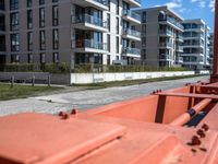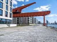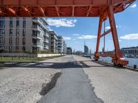 A clear day reveals the modern architecture and public utility of Bremen, a city in Northern Europe, and its harbor Bremerhafen. The cityscape features a mix of high-rise condominiums, roads, and vegetation, as well as a pier, bridge, boat, and crane in the backdrop.