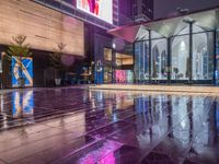 A view of the city skyline, featuring modern architecture, glass windows, neon lights, and a lake in the foreground, illuminated by tints of blue, purple, and pink in the daylight. Located in Guangzhou, Guangdong, China, this urban design provides public space and leisure for many in the metropolitan area.