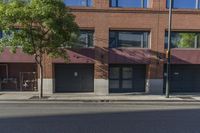 A view of a city with asphalt roads, buildings, and residential areas during the day. Trees line the streets, providing a natural touch to the urban landscape. Windows and doors of the buildings can be seen, showcasing the profiles of the real estate. The brick buildings and curbs add to the urban design. The clear sky creates a pleasant atmosphere.