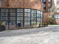 A cobblestone road curves through an alley-way of brick walls, wood floors and windows in the city of Hinterhof, Germany. A gas line runs parallel to the public space, and the facade of a factory is visible in the background. Symmetry and classic architecture give the metropolitan area its residential charm, with tints and shades of trees, grass, flowers and sunlight adding to the urban design.