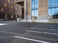 An urban design in the city of Holland, Netherlands, is illuminated in the sunlight. The building is composed of a mixture of materials including wood, asphalt, composite material, brick, and curb, with a window and door profile. The road surface and parking property, along with the vegetation and public space, complete the scene, showcasing modern architecture and industrial fixtures.