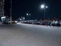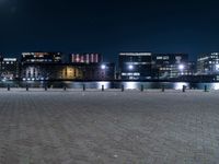 A view of Holland's cityscape at midnight, featuring a modern architecture of high-rise buildings, river pier, road surface, and street light. The clear sky reveals the infrastructure and composite material of the metropolitan area, illuminated by artificial light and electricity.