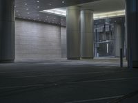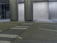 two large silver pillars in front of a building at night with street lights shining on them