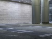 a modern restroom area with tiled floor, white columns and tiled walls and flooring