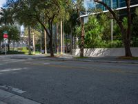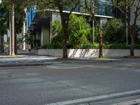 A busy office building on a sunny day casts a hard shadow onto the asphalt road in Miami Beach, Florida, USA, highlighting the bustling city life of the business district.