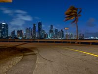 A dark night in Miami Beach, USA, where an armco barrier and guard rail line the coastal road, connecting the urban cityscape to the ocean.