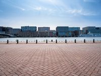 The sun rises over the river in Holland, illuminating the modern architecture of the cityscape and the paver roads that lead to the pier and harbor. The skyline is dotted with high-rise buildings, and a flag waves in the open space. The city's urban design is highlighted by the clear sky and the surface of the lake, creating a beautiful landscape of city life, residential areas, and leisure.