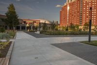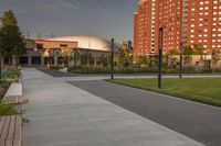A high-rise condominium building surrounded by urban design elements in Toronto, Canada. The residential area features well-maintained properties, open spaces, and tree-lined streets, creating a pleasant and inviting neighborhood.