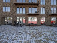 A composite material road surface leads to a modern architecture condominium building in a residential area of Holland, with a pier and jetty, a lighthouse, a vehicle, a boat, and a bank in the background, as the clear sky of dawn reveals flowers, trees and vegetation near the harbor and lake.