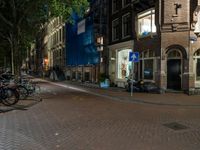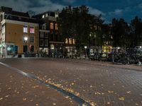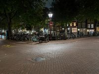 A bicyclist riding past classic Dutch architecture, street lights and roadside vegetation in a residential area of Amsterdam, Netherlands. The cityscape is illuminated by both natural and artificial light, creating a unique urban design. Automotive lighting and a motorcycle are seen in the background.