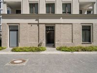 A black-and-white photograph of a tire against the backdrop of modern architecture in Berlin, Germany. The cityscape includes a cobblestone alley-way, a high-rise condominium, and a public space with asphalt roads, brickwork, outdoor benches, and lush vegetation. The clear sky and warm sunlight create hard shadows, tints and shades, and an overall sense of city life.