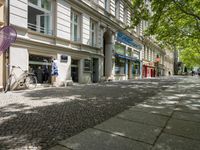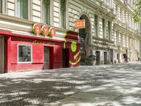 A snapshot of urban exploration in the art district of Berlin, Germany. From the cobblestone roads and mixed-use buildings to the graffiti and street art, this city is filled with a vibrant mix of architecture, infrastructure, and human settlements. The red bicycle and motion blur of a vehicle on the hard shadow surface create a vibrant atmosphere of life and motion in this European town.