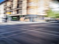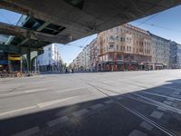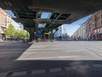 A snapshot of urban design in the bustling city of Berlin, Germany. Cars and pedestrians move in the street while buildings of mixed-use, residential and public space fill the cityscape. The yellow lane lines on the asphalt are reflected in the shimmering surface of the bridge, while shadows and light cast from the trees and clouds provide a dynamic contrast to the scene.