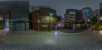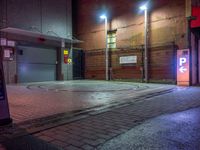A view of a paver road in the Nihonbashi area of Tokyo at night, illuminated by artificial lighting and street lights, with a wet asphalt surface.