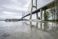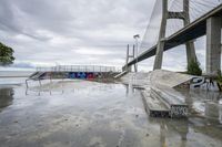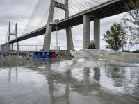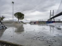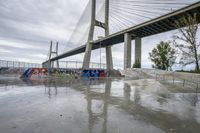The dawn of a gloomy day in Lisbon, Portugal reveals a unique composite of urban design: a concrete extradosed bridge, skatepark, lake, graffiti wall, and public space all illuminated by a street light amidst a grey sky. The bridge, composed of a box girder with a cable-stayed suspension, reflects in the water and is surrounded by trees and vegetation.