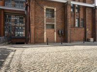 A mixed-use neighborhood in the heart of Berlin, Germany, featuring a modern industrial art district with cobblestone streets, brick facades, factories, warehouses, and apartment buildings set against a backdrop of a public courtyard and tree-lined roads.