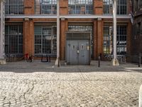 the two doors are in front of the tall brick building in this photo, there is a bench at one end of the path