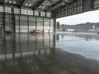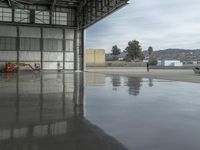 View of an expansive factory complex in Los Angeles, California, USA featuring a mix of modern glass windows, concrete structures, metal roofs, and loading docks. The open space is illuminated by a cloud-filled day sky, and the reflection of the surrounding cityscape can be seen on the surfaces of the buildings and structures.