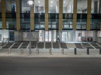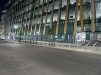 A modern high-rise building from a financial district in Berlin, Germany, is illuminated by artificial light at night. Symmetrical facade and grey tints and shades of the building are contrasted with the dark asphalt road surface, vegetation, and street light.