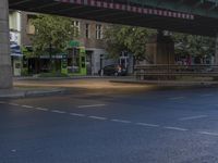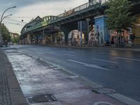 A view of the city of Berlin, Germany, showcasing its urban infrastructure and vibrant street life. The photo features a road with asphalt, a bridge, an underpass, and various buildings. The day is bright, with trees and vegetation adding a touch of greenery. Clouds float in the sky, while vehicles, including cars and bicycles, can be seen on the road. The image captures the essence of urban design and architecture in Europe's metropolitan areas.