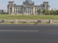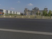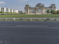 The Reichstag Building in Berlin, Germany stands in profile, surrounded by modern architecture, vegetation, and a clear sky. Asphalt roads, tar, public space, and street lights make up the urban landscape. A bicycle, vehicle, and a flag appear in the foreground.
