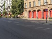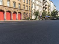 A view of the classic architecture and urban design of Berlin, Germany. The residential area is filled with roads, buildings, trees, doors, windows, and other elements of infrastructure. The bright tints and shades of the tar road surface contrast with the brickwork of the facades, creating a unique landscape of real estate and property.