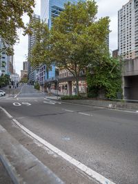 A view of a cityscape with tall office buildings, lush vegetation, and a road surface.