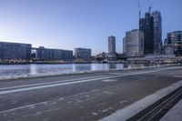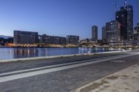 A stunning urban landscape at dawn, showcasing a city skyline with high-rise buildings, modern architecture, and artificial lights reflecting on the calm lake surface.