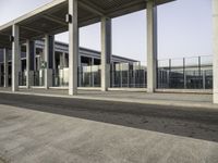 A close-up of an urban landscape featuring a composite material bridge and a metropolitan area of asphalt, concrete, and grass, illuminated by the early morning sun. Grey tints and shades of the metal, glass, and wood structures create a symmetrical view of the area.
