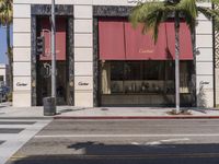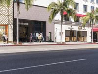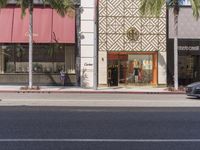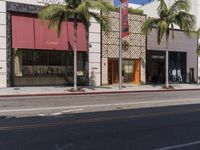 A view of a bustling city street in Los Angeles, California, USA. The asphalt road is lined with various buildings, including residential areas, office buildings, and shops. The vibrant cityscape is filled with trees, vegetation, and storefronts. The sunny day illuminates the facades, windows, and doors, creating a colorful and lively scene in this metropolitan area.