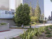 A view of the bustling city of Los Angeles, California, USA, with its high-rise buildings, concrete streets, and lush green vegetation