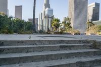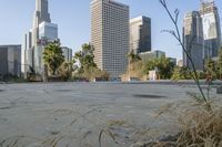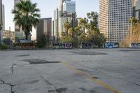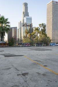 A view of the metropolitan area of Los Angeles, California with its iconic skyscrapers and cityscape, showcasing the urban design and architecture. The clear sky and open spaces provide a contrast to the concrete jungle, while the graffiti walls and street art add a touch of art district charm. The parking lots and road surfaces are bustling with city life, as motor vehicles and pedestrians navigate through the city. The high-rise condominiums and residential areas are surrounded by trees and green spaces, creating a mix of nature and urban infrastructure.