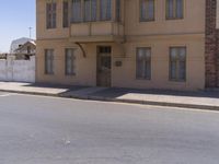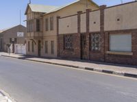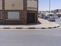 A view of a city street in Luderitz, South Africa, with buildings, vehicles, and a clear sky above.