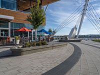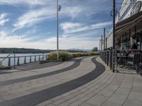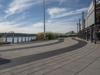 A view of an urban landscape featuring a road surface and a street light, surrounded by vegetation and urban design elements.
