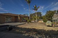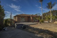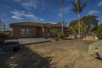 A view of an urban landscape with sand, buildings, and trees during the day. The image shows a house with open space, surrounded by vegetation. The road surface and concrete add to the construction of the neighborhood, while the trees provide shade and a sense of tranquility.