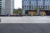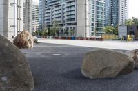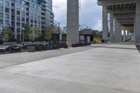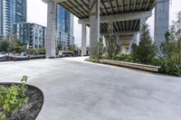 A stunning view of the modern architecture and infrastructure in downtown Toronto, Ontario. The concrete streets and walkways lead to a beautiful public space lined with trees and sculptures.