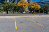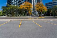 A view of the bustling city of Toronto, Ontario, with its vibrant urban design and straight road leading towards a parking lot. The asphalt surface reflects the clouds in the sky, creating a striking image with hard shadows on a sunny day.