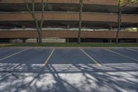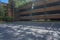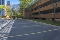 parking lot with parking garage, tree, and building in background and sunlight on street