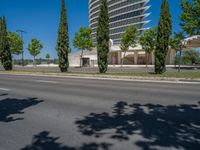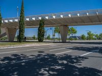 This photo captures a modern urban landscape in Zaragoza, Spain. The image shows a road and an underpass with modern architecture. The clear sky creates hard shadows on the asphalt. The bridge in the background adds to the architectural beauty of the city.
