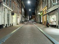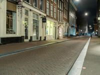 A view of the city at night in Amsterdam, Netherlands. The asphalt road surface, white and black curb, street lights, and store fronts make up the urban landscape and infrastructure of this residential area. A bicycle wheel and a tree with a houseplant provide a hint of nature in this urban design.