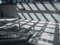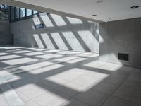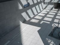 The modern architecture of Potsdamer Platz in Berlin, Germany is highlighted in this view of the Sony Center, featuring black and white zebra crossings, handrails, stairwells, and the reflection of the glass lobby in the asphalt road surface.