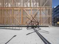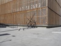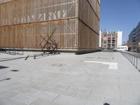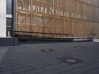 A snapshot of modern architecture and urban design in the German metropolis of Berlin. The cityscape is composed of a mixture of brickwork, concrete, metal, wood, and other composite materials with elements such as a bench, handrail, fence, gate, and a variety of tiles and flooring. Vegetation and trees are seen in the background, providing a contrast to the hard shadows of the day.