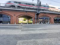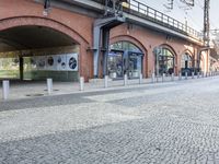 A modern building with an arcade facade and cobble stone road surface in the metropolitan area of Berlin, Germany stands out against the clear sky. Urban design, city life, and public transportation are all evident in the neighborhood.