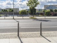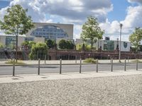 A view of a vibrant urban neighborhood in Berlin, Germany, featuring modern architecture, a cobblestone street, and a residential area with vegetation, trees, and a public space. A clear blue sky frames the scene, highlighting the roads, street lights, and infrastructure of the area.